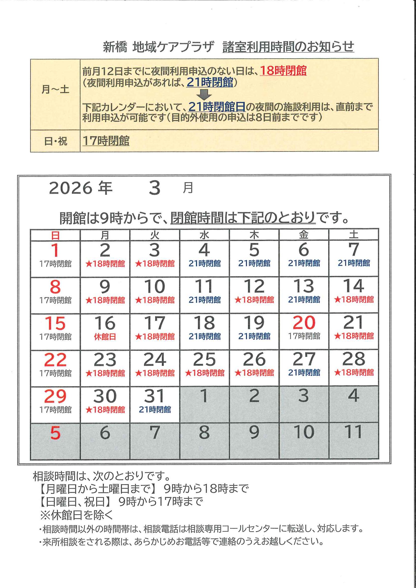 新橋地域ケアプラザの2026年3月度諸室利用時間は以下の表のとおりとなります。