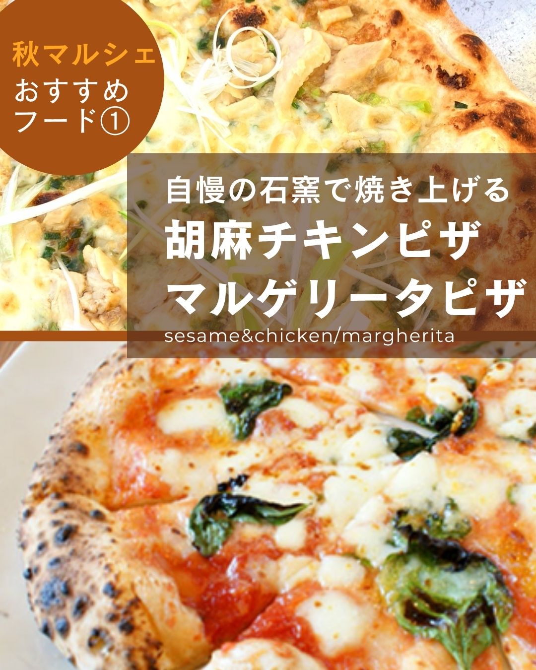①ピザ2種:ピザ専用の石窯で焼かれる、定番「マルゲリータ」に加えて「胡麻チキン」も新登場!