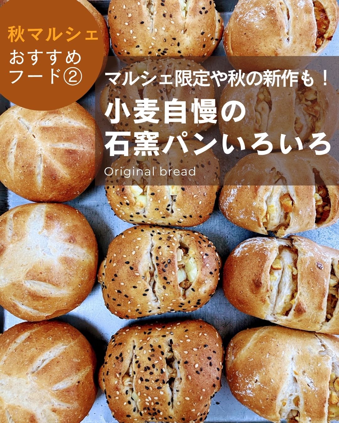 ②小麦自慢のパン:自分たちで栽培収穫製粉をした「ぼくらの小麦」を使ったパン各種。マルシェ限定での「くるみとチーズの全粒粉食パン」やかぼちゃやさつまいもを使った秋製品、新作サンドイッチなど豊富にご用意します!