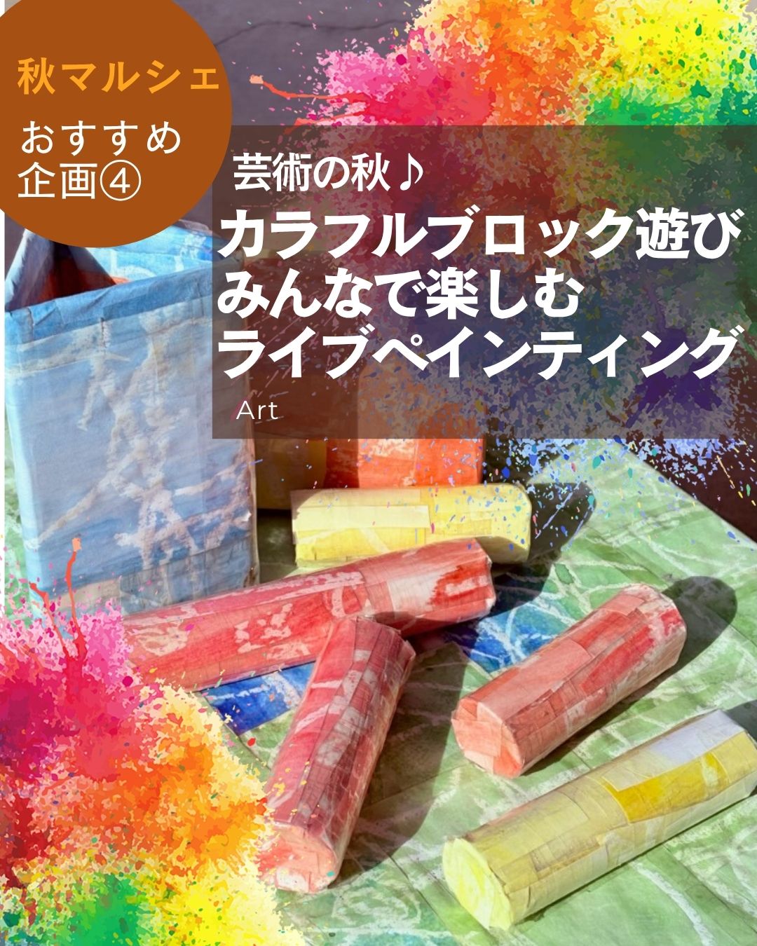 ①ブロック遊び/ライブペインティング:紙製のカラフルブロックで遊べるコーナーや、当日参加無料のライブペインティング企画もあります。みんなで思い思いに描いて素敵な1枚の絵を完成させましょ。