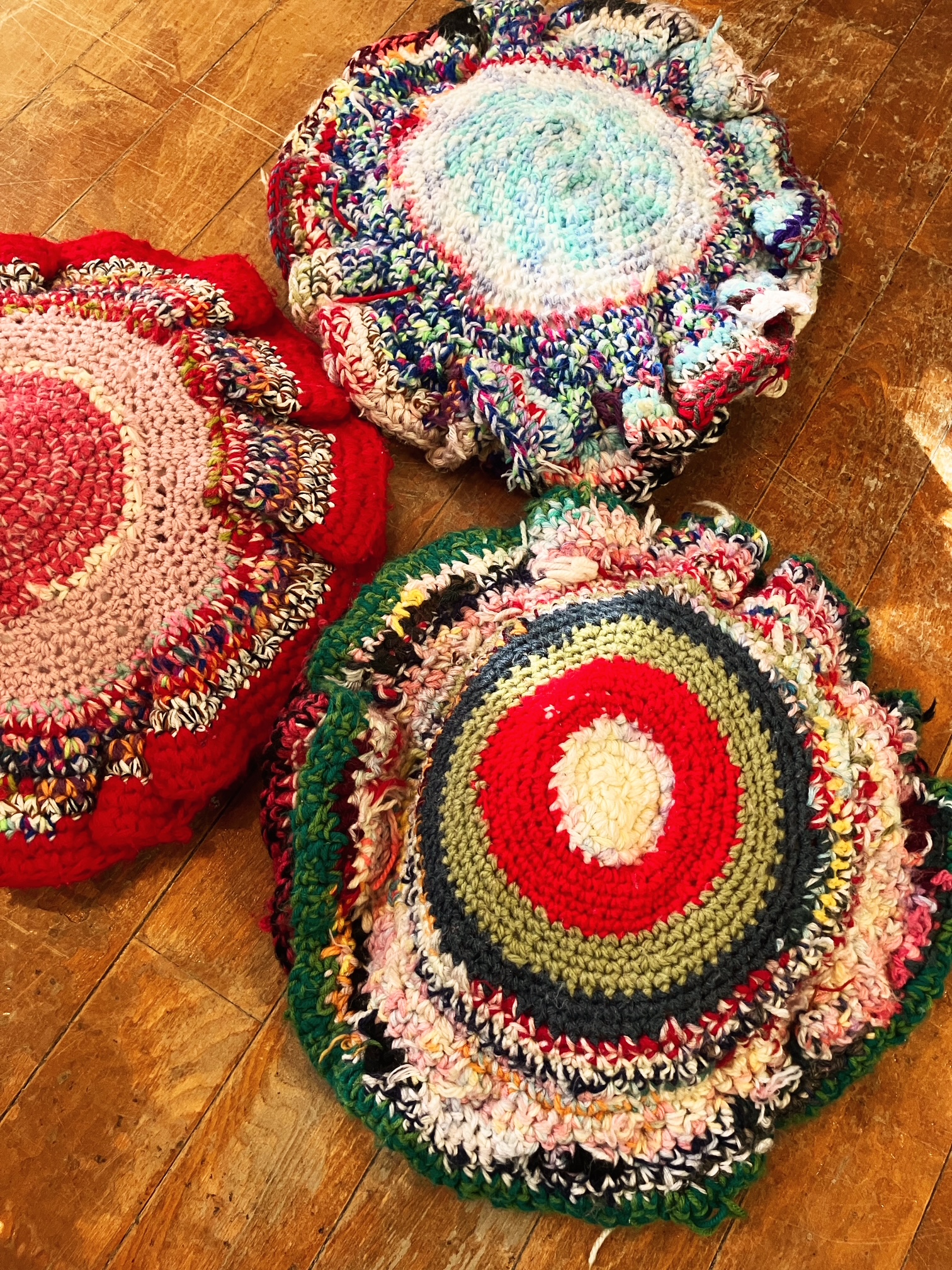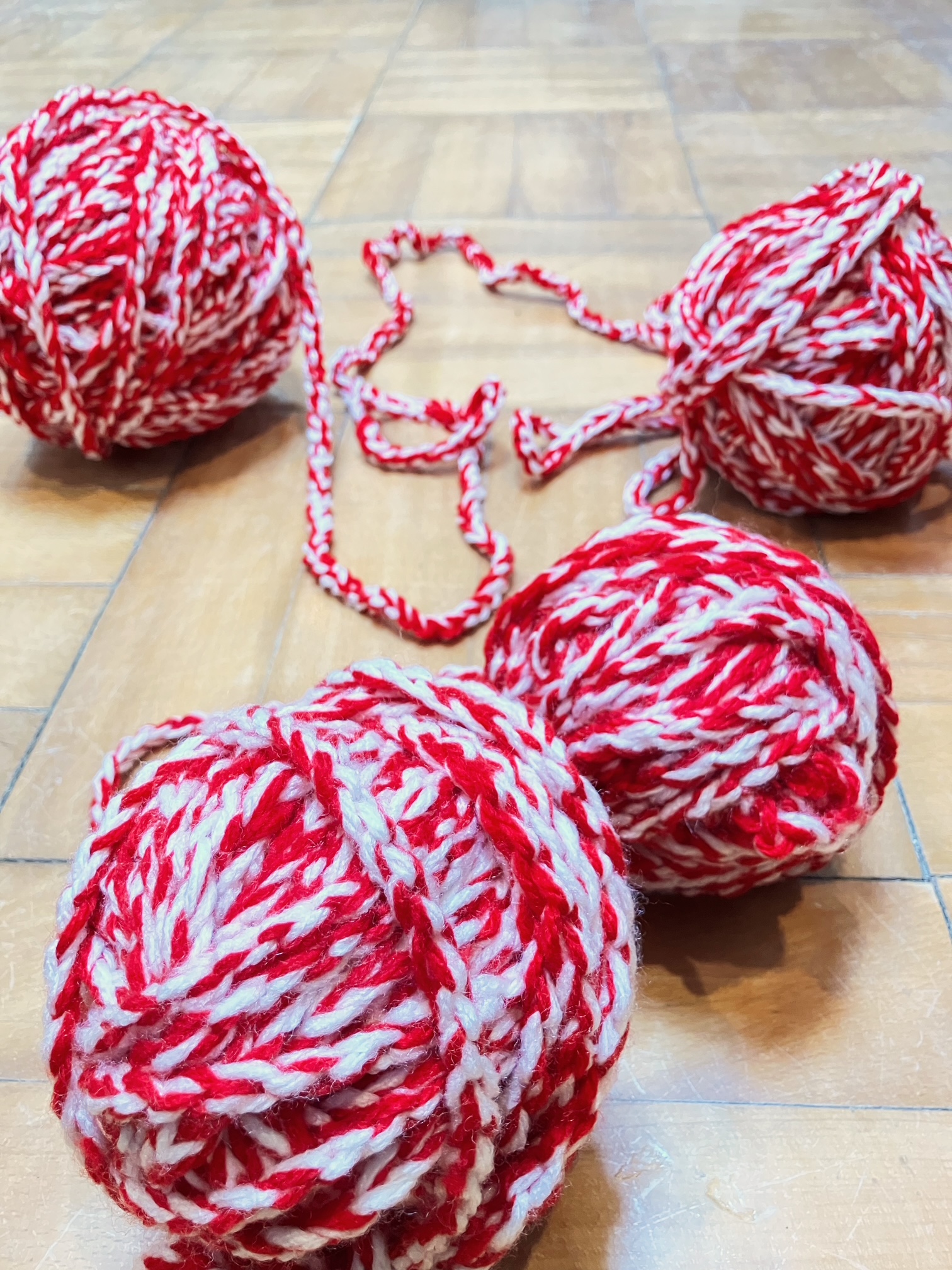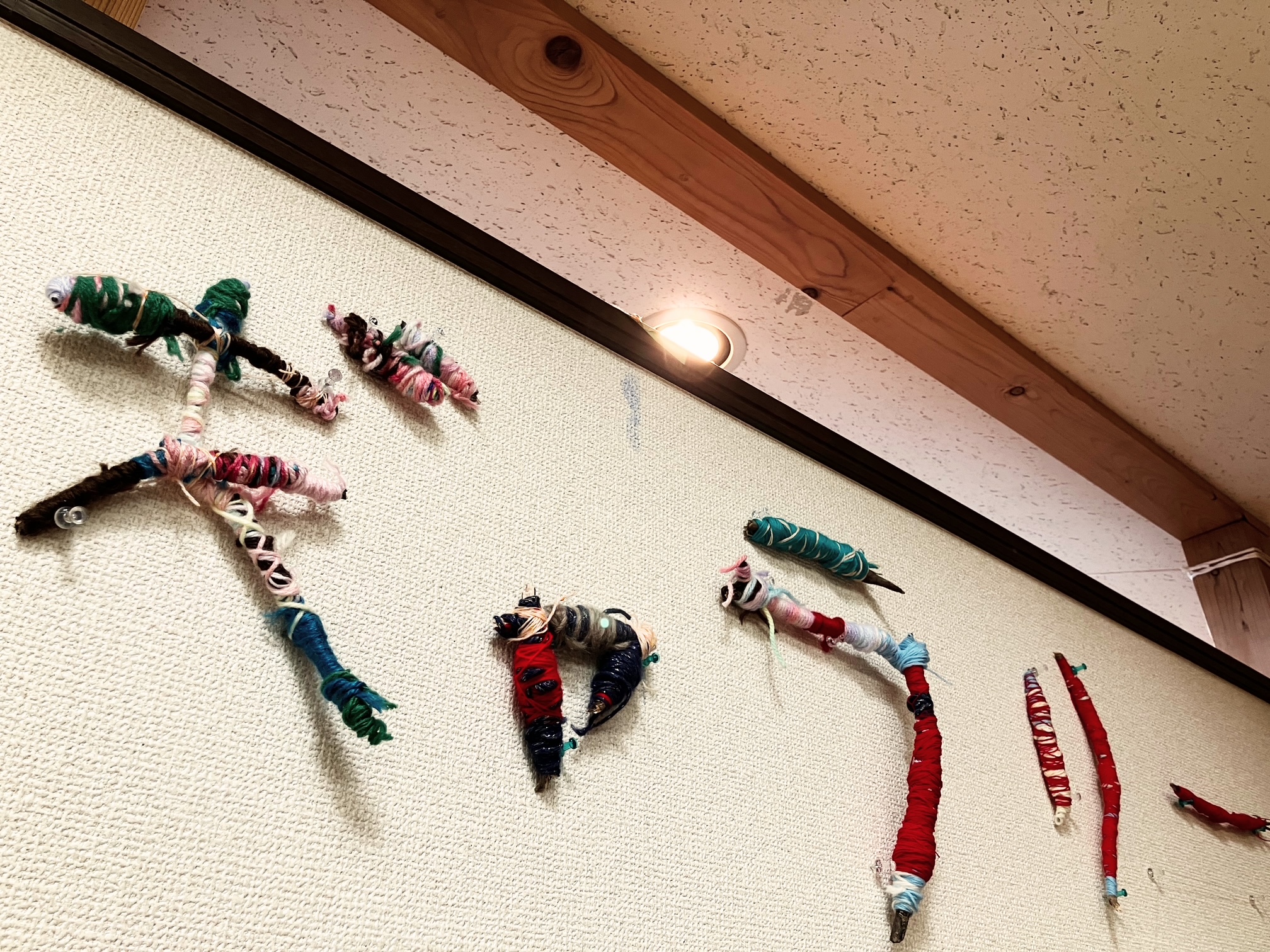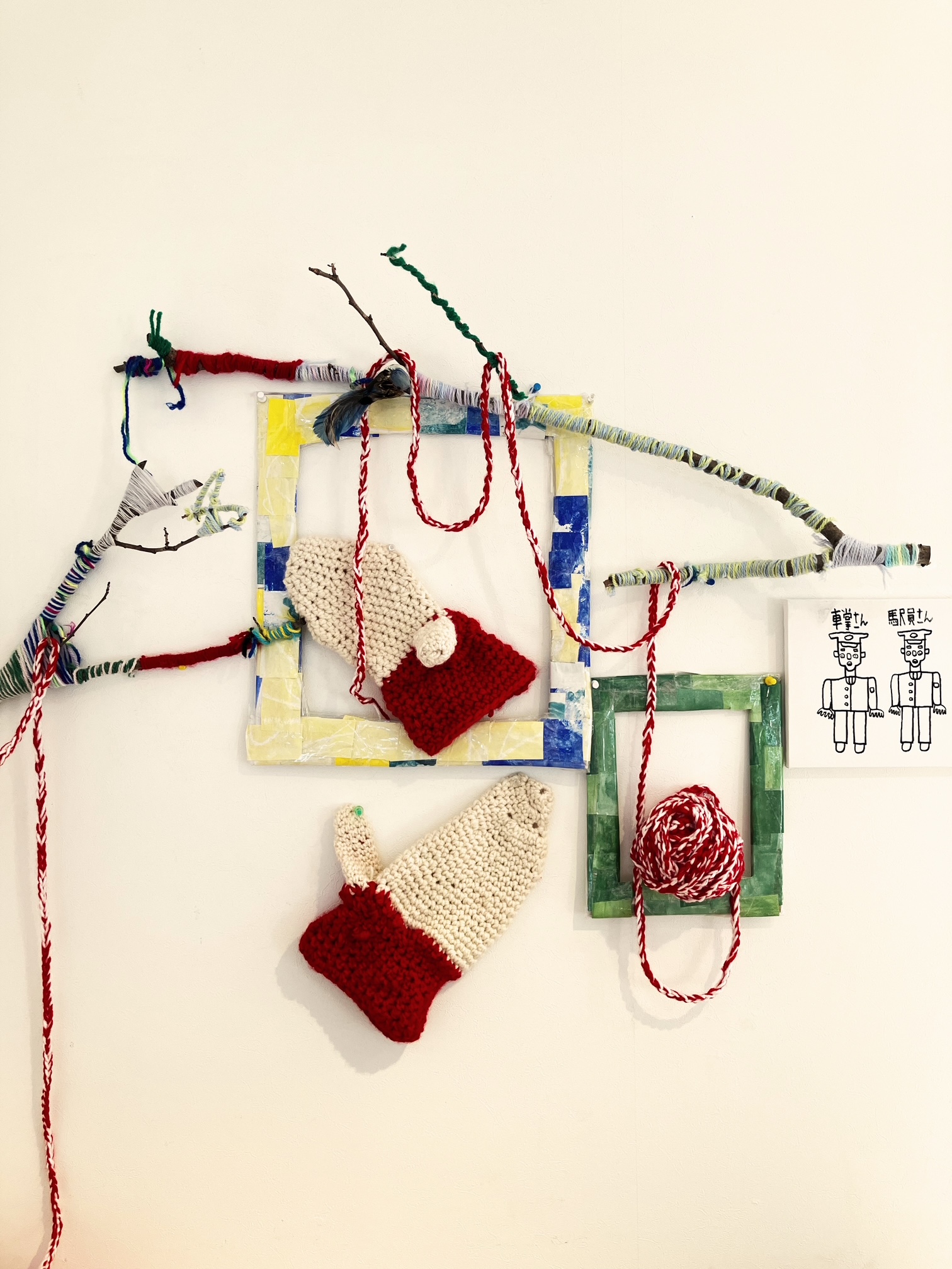 一見ただの毛糸玉に見える物も、長く、長く、くさり編みをつないで作った作品だったり、毎日少しずつ編んだ小さなニットをつないだマフラーだったりと、かわいらしいものが色々とありました。