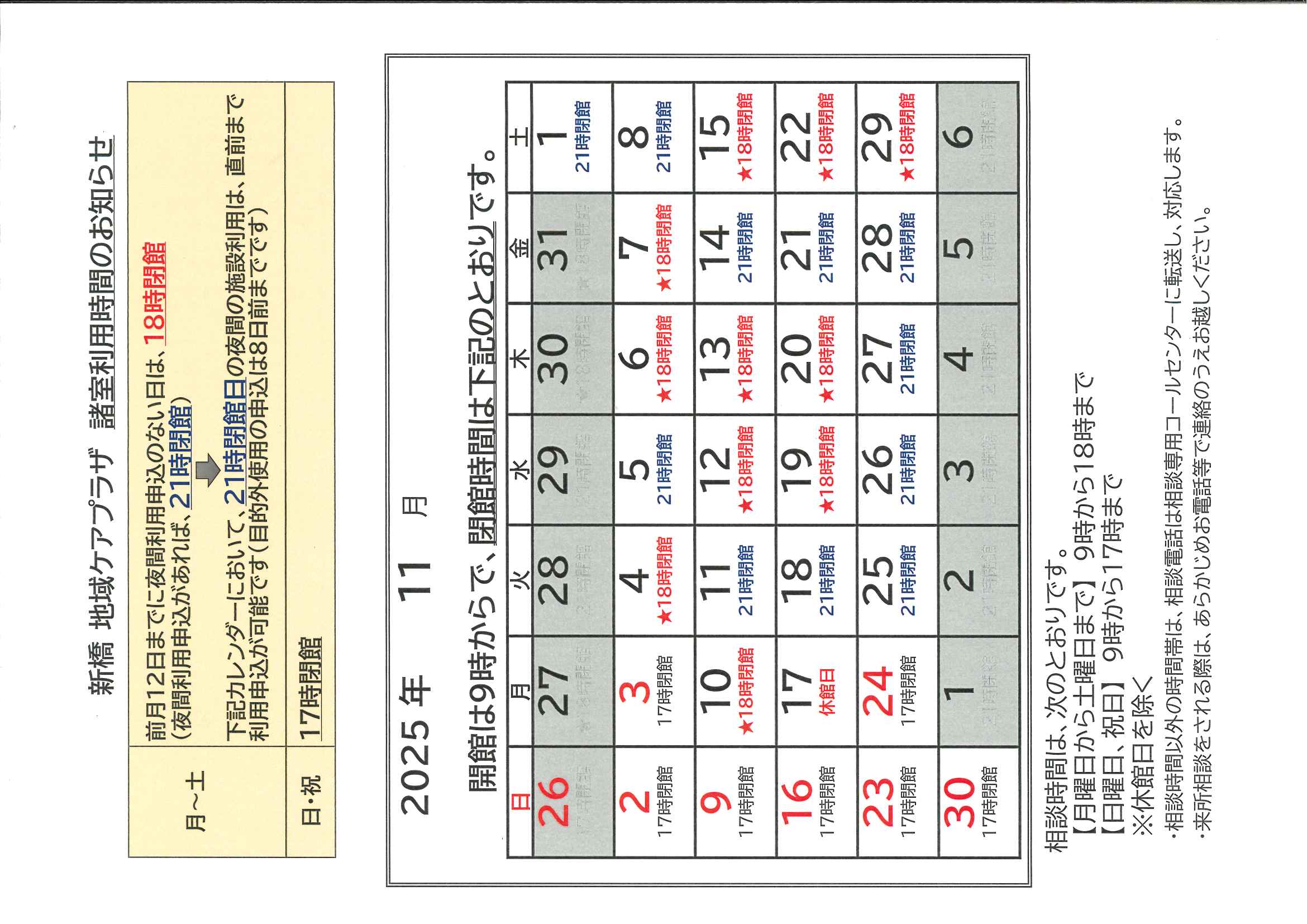新橋地域ケアプラザの2025年11月度諸室利用時間は以下の表のとおりとなります。