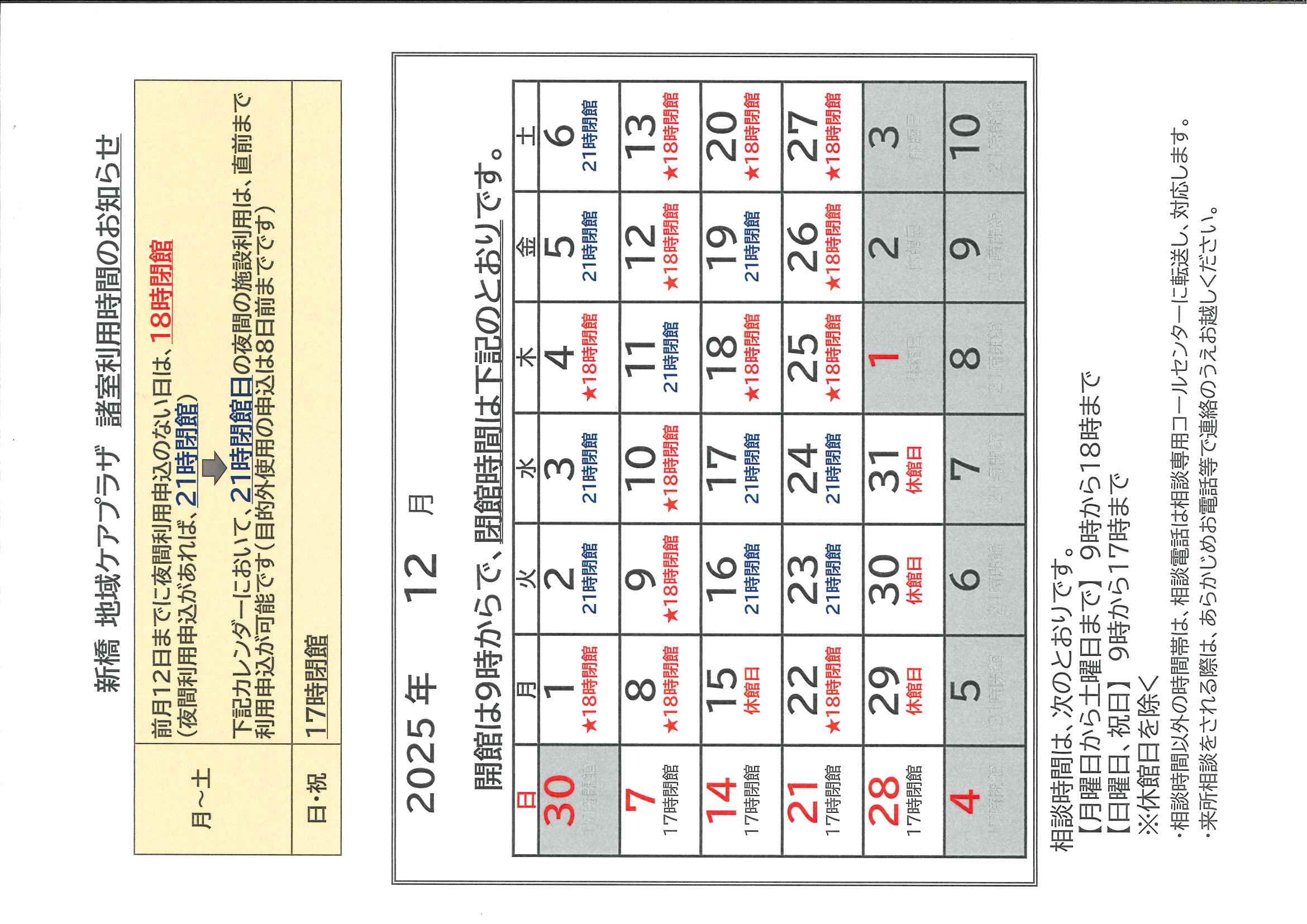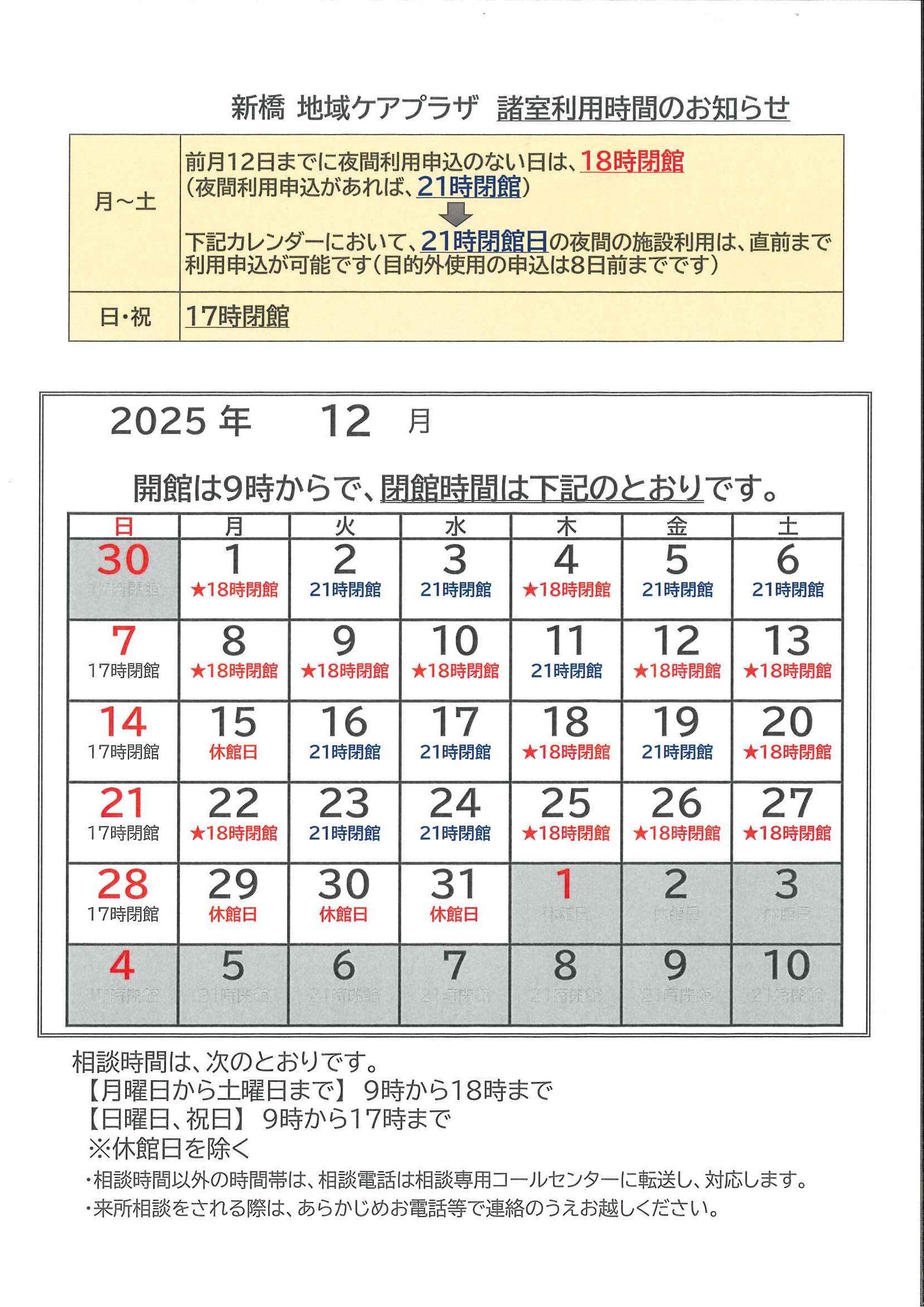 2025年12月度 諸室利用時間のお知らせ